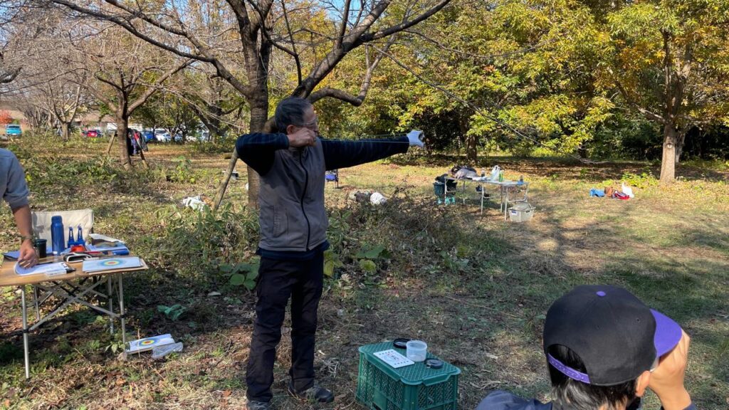 少々悩んでいたのがAグループ伊東市支部のK川さん。聞けば、屋外で撃つのは初、しかもスチール弾初、しかもしかも15m初ということで弾のドロップに苦しんでいました。