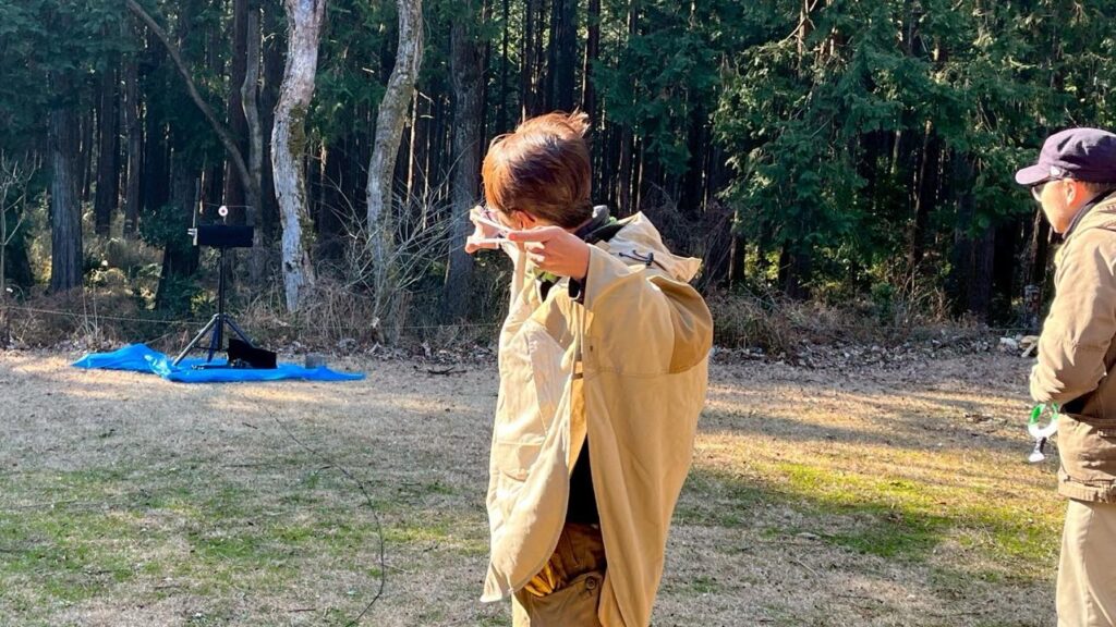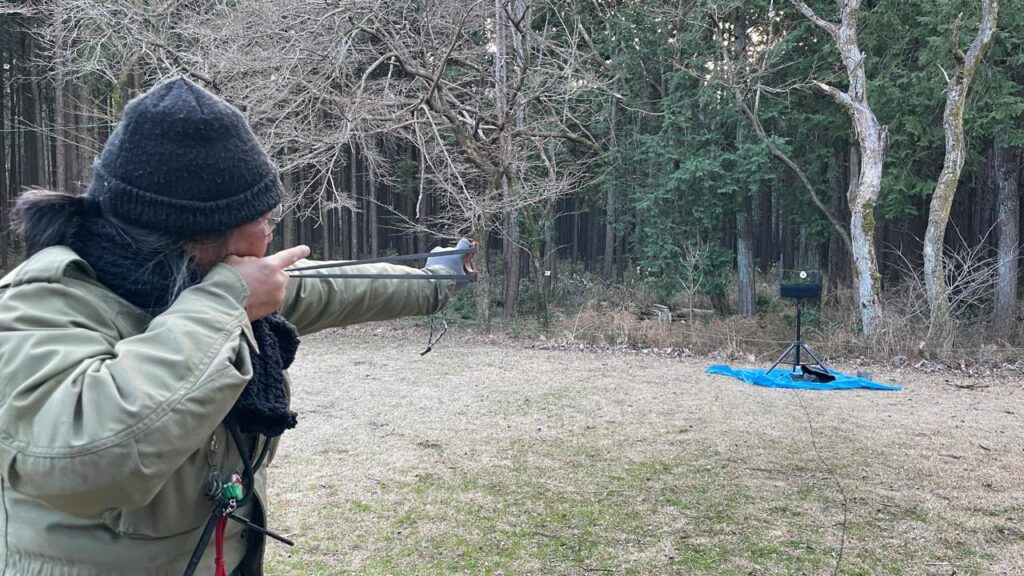 チェックイン後は早々にテント設営し、いざ練習!なのですが、風が強く、いつものバックストップを設営するのも憚られ、K泉さんの持参いただいた自作のキャッチボックスでつつましく順番に打ち込みする者、あるいは周りの森へ向けてクレイ弾でフィールドシューティングに興じる者と思い思いにシューティングを楽しみました😊