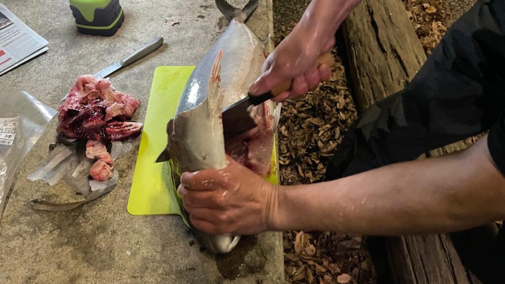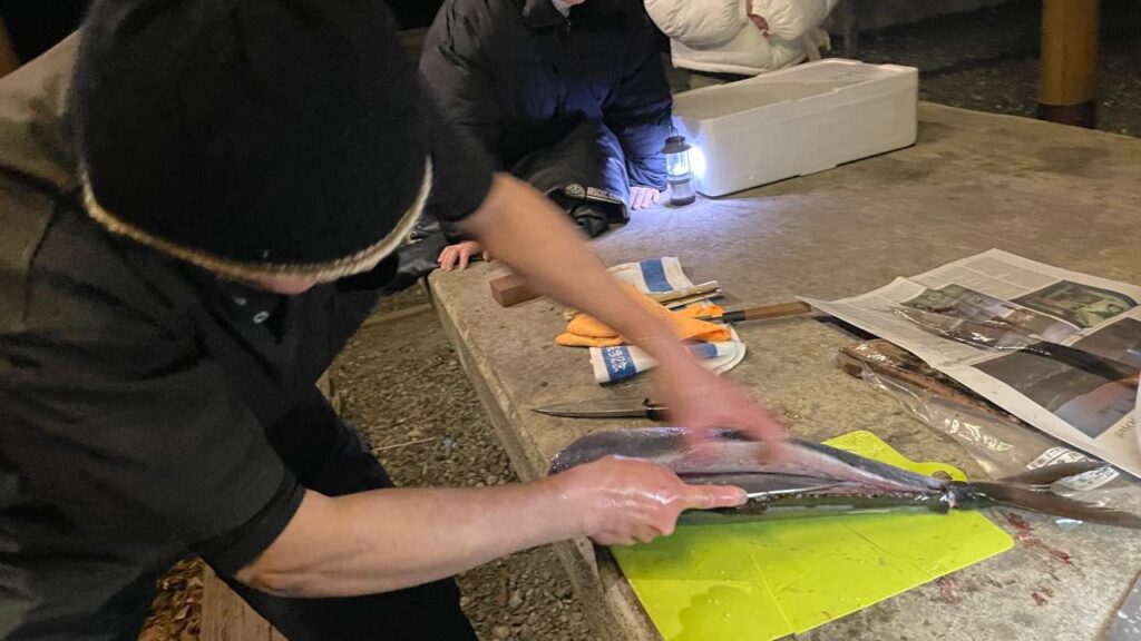 日もとっぷりと暮れた頃「やっぱりここらで活きのいいヤツをワサビ醤油をチョイとつけてクイッといきたいよね〜」と誰かが呟くと、今度はM内総支部長がカンパチ🐟丸ごと一本を捌くぜ!と宣言!