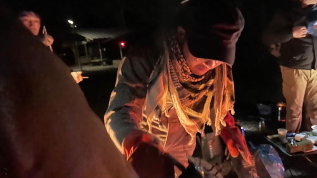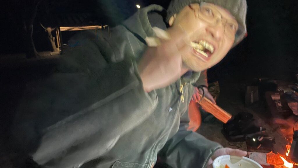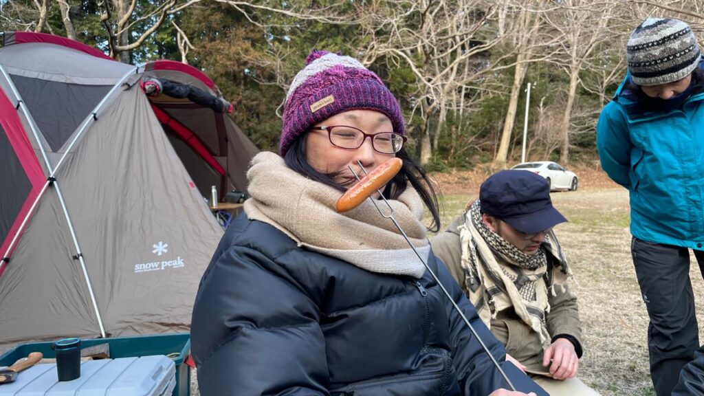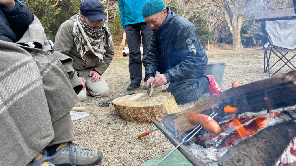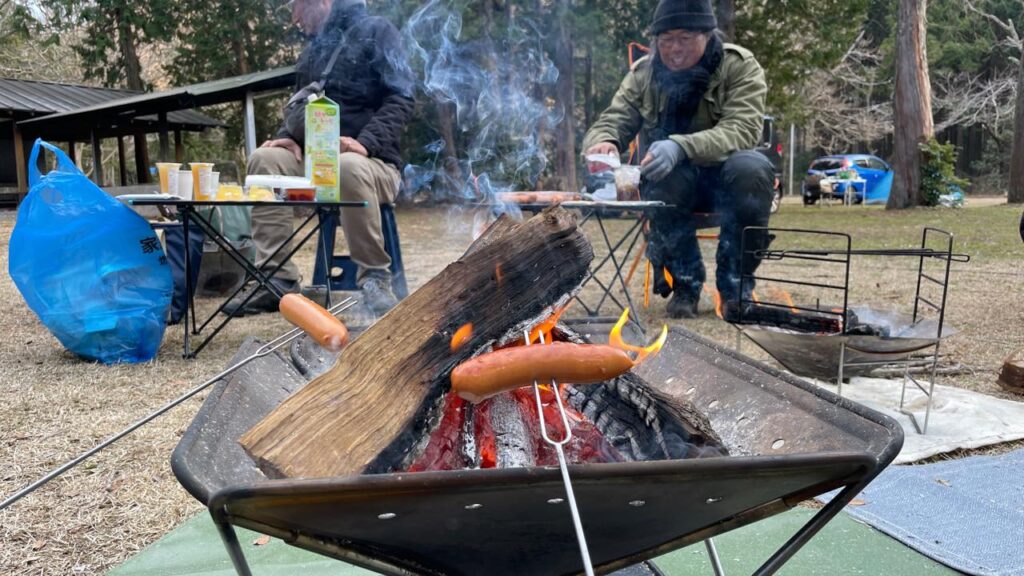 すると「なんか腹減らない?」となり、まだ明るいうちから焚火を興してフランクフルトを炙りパクつく面々。